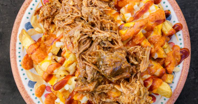 - Extiende uniformemente la carne de cerdo deshilachada sobre las patatas.